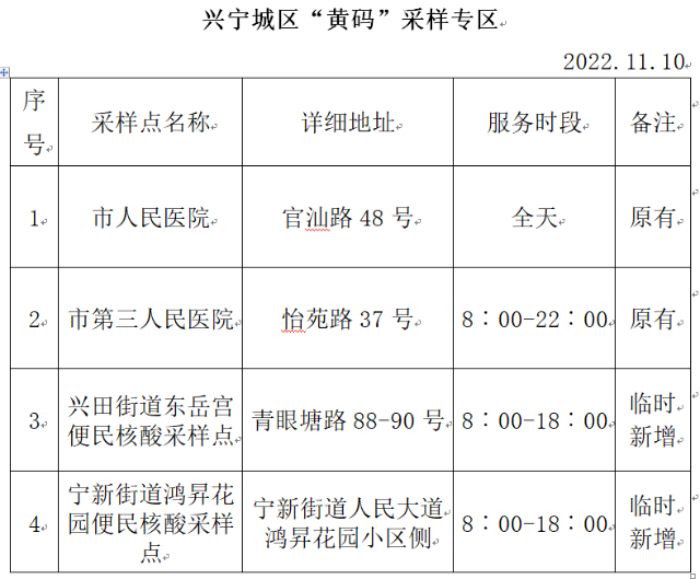 1.原兴田街道东岳宫便民核酸采样点、宁新街道鸿昇花园便民核酸采样点,均调整为“黄码”采样专区。