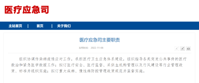 近日,国家卫生健康委员会对内设机构正式做出调整,原医政医管局更名为医政司,原卫生应急办公室更名为医疗应急司,同时撤销疾病预防控制局、综合监督局。 原医政医管局更名为医政司,医政司下设综合处、医疗资源处、医疗机构处、医疗管理处、医疗质量与评价处、护理与康复处。 该司主要职责为拟订医疗机构及医务人员、医疗技术应用、医疗质量和医疗服务等行业管理政策规范、标准并监督实施,承担推进心理健康和精神卫生、护理、康复事业发展工作;拟订公立医院运行监管、绩效评价和考核制度等。 原卫生应急办公室(突发公共卫生事件应急指挥中心)更名为医疗应急司,医疗应急司下设综合处(行风处)、医疗应急管理处、医疗应急指导处、公共卫生医疗管理处、医疗卫生安全和血液管理处、医疗监督处。 该司主要职责为组织协调传染病疫情应对工作,承担医疗卫生应急体系建设,组织指导各类突发公共事件的医疗救治和紧急医学救援工作;拟订医疗安全、医疗监督、采供血机构管理以及行风建设等行业管理政策、标准并组织实施;拟订重大疾病、慢性病防控管理政策规范并监督实施。 同时国家卫健委原机关党委更名为机关党委(党组巡视工作领导小组办公室),负责机关和在京直属单位党的建设和纪检工作,领导机关群团组织的工作,承担内部巡视工作。 机关党委(党组巡视工作领导小组办公室)设立机关纪委,承担机关和在京直属单位纪检、党风廉政建设有关工作。 此外,国家卫健委机构设置中不再设立疾病预防控制局、综合监督局。 2022年2月,中共中央办公厅、国务院办公厅发布《关于调整国家卫生健康委员会职能配置、内设机构和人员编制的通知》,公布了国家卫健委职能配置、内设机构和人员编制调整事项。 调整后,国家卫健委设19个内设机构及机关党委(党组巡视工作领导小组办公室)、离退休干部局。机关行政编制464名。设主任1名,副主任4名,司局级领导职数80名(含机关党委专职副书记1名、机关纪委领导职数1名、卫生健康监察专员10名、离退休干部局领导职数2名)。 来源:国家卫健委官网