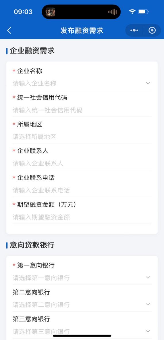 如有融资需求,请填写意向银行和走访时间,星标为必填项。