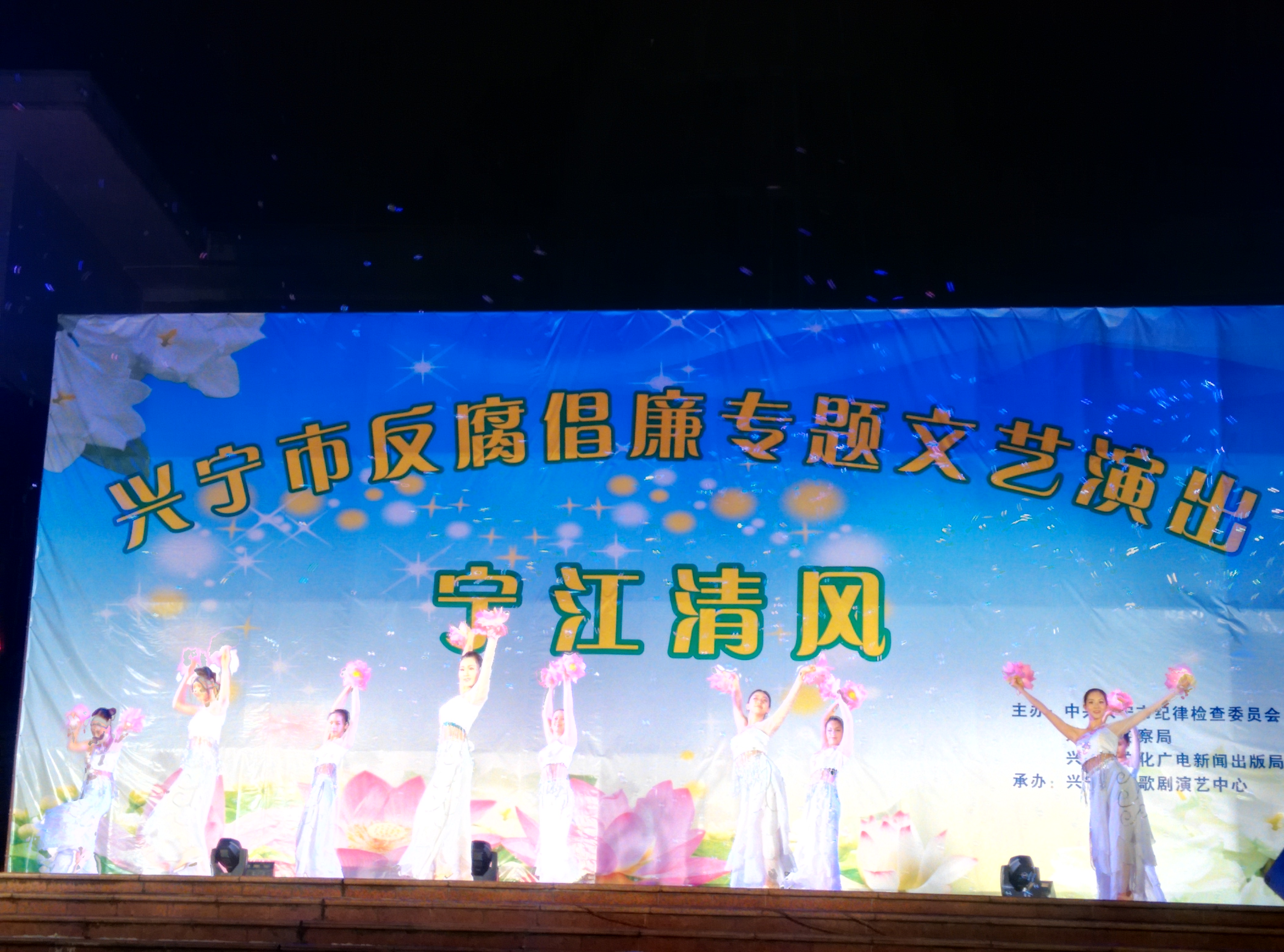 8月20日晚,由市纪委、监察局、文广新局联合主办,山歌剧团承办的“宁江清风”反腐倡廉专题文艺晚会在文化广场隆重上演。市领导刘锐清、蓝新环、袁勇华同群众一起观看了晚会。晚会在一首大气磅礴的歌曲《中国梦》中拉开序幕,随后,歌舞、古筝、山歌、小品等十多个精彩节目纷纷上演。其中,舞蹈《荷风晨露》伴随着激扬振奋的音乐,反映出荷花洁身自好,出淤泥而不染的风骨;小品《同学会》则通过诙谐幽默的艺术形式对贪污腐败现象进行讽刺,引得在场观众发出阵阵欢笑和喝彩;快板表演唱《说一说来唱一唱》则用欢快活泼的形式展现了当前我市反腐倡廉工作取得的成效,并告诫广大干部在工作和生活中要修身慎行,清廉自律。