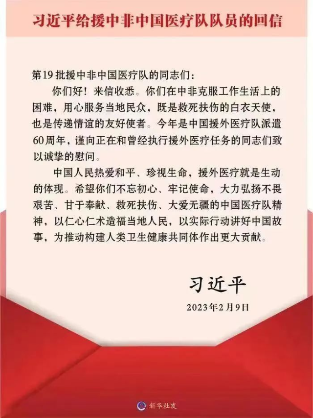 今年是中国援外医疗队派遣60周年。2月9日,总书记给第19批援助中非共和国的中国医疗队队员回信,向正在和曾经执行援外医疗任务的同志们致以诚挚问候并提出殷切期望。“既是救死扶伤的白衣天使,也是传递情谊的友好使者。”习近平总书记在回信中予以中国援外医疗队高度评价。