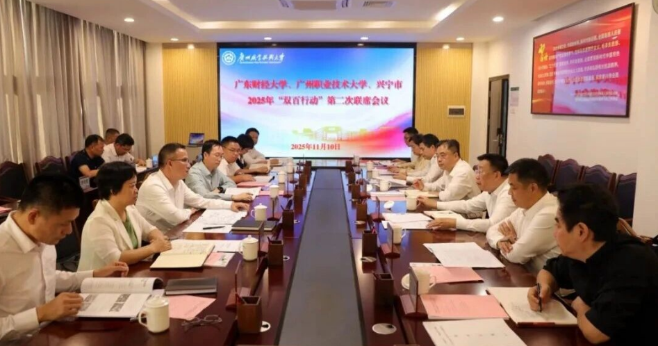 委书记罗达祥等出席会议。 会议通报了“双百行动”工作情况,校地三方围绕下一阶段工作重点展开深入交流。自“双百行动”实施以来,校地三方聚焦“兴宁鸽”产业发展、镇村规划建设、兴宁非遗文化发展、人才培养培训、基础教育帮扶等方面,同向发力、同题共答,有力推动兴宁经济社会发展。其中《发挥高校优势、锚定规划蓝图助力兴宁农文旅产业高质量发展》案例被评为省“双百行动”乡村产业发展高校联盟案例一等奖,入选省“百千万工程”《广东省农文旅融合发展典型案例集》,成为全省农文旅融合发展的示范样板;高校驻兴服务队被评为2025 年梅州市推进“百千万工程”工作优秀集体。 罗达祥介绍了兴宁经济社会发展情况及下来发展思路,并代表兴宁市委、市政府和百万兴宁人民对两所高校一直以来对兴宁发展的关心支持表示衷心感谢。他说,近期,习近平总书记到梅州市考察调研,令我们深受鼓舞、倍感振奋。当前,“百千万工程”的号角正劲,“双百行动”的蓝图已展,开创兴宁现代化建设新局面,需要做到经济好、环境好、作风好,更离不开两所高校的鼎力相助。希望校地双方把“双百行动”当成共同的事业,着眼兴宁未来发展,凝心聚力,奋发有为,探索创新更多富有成效的合作项目,在“十五五”系统谋划推动兴宁长远发展方面取得更大成效。充分发挥高校经济管理、技术技能等优势,继续在“3+3”产业集群打造、岭南国防教育基地建设、“兴宁鸽”品牌塑造、军旅产业发展等方面提供更多支持,助力兴宁建设现代化产业体系。同时,诚挚邀请高校领导到兴宁实地指导,拓宽发展思路,书写校地共建新篇章。 林洽生表示,当前,正值“百千万工程”攻坚克难、力争“三年初见成效”的关键节点。广州职业技术大学将以助推兴宁高质量发展为牵引,着眼长远,立足兴宁实际,系统规划,为兴宁未来发展蓄势赋能。发挥高校优势,围绕高技能人才培养、基础教育提质、职业教育发展等方面,积极探索更多有效路径,深化合作交流,助力兴宁教育高质量发展。尽高校所能,讲好兴宁故事,宣传推介兴宁,在品牌设计、电商营销、智慧养殖、冷链物流等环节提供技术支持与解决方案,加强消费帮扶,助力“兴宁鸽”等特色产业发展,共同打造校地合作的成功典范。 郑贤操对兴宁今年以来经济社会发展取得的成效表示祝贺。他说,今年是“十四五”规划收官之年,也是“十五五”规划编制的谋划之年。两所高校将深入学习贯彻习近平总书记视察广东重要讲话精神,贯彻落实省委关于“双百行动”工作部署,齐心协力推动兴宁高质量发展。广东财经大学将锚定“时与势”,强化使命担当,推动校地合作实现新突破,全力助力兴宁“百千万工程”从“三年初见成效”向“五年显著变化”迈进。聚焦“特与优”,秉承“兴宁所需、高校所能”,将学校的学科优势、人才资源、科研成果与兴宁的发展规划、产业基础、民生需求、教育提质等精准对接,做大做强“兴宁鸽”“丝苗米”“单丛茶”等特色农业,做深农文旅体康融合发展,做实民生支撑,深度参与镇村规划编制,做美城乡风貌。强化“协与同”,加强协同联动,完善校地融合、成果转化、资源共享等机制,以机制创新凝聚攻坚合力,共同推动“双百行动”行稳致远、取得实效。
