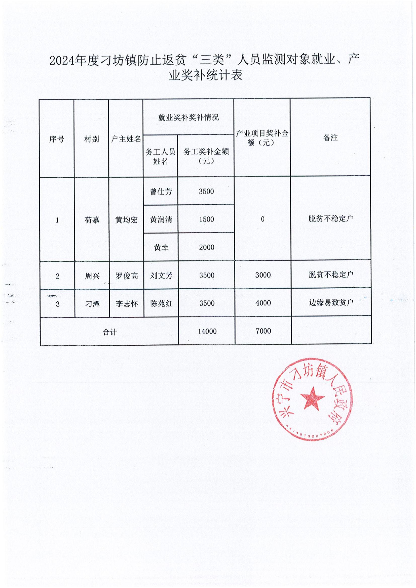 2024年度刁坊镇防止返贫“三类”人员监测对象就业、产 业奖补统计表