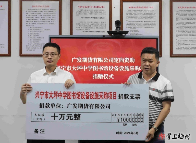活动还举行了定向资助时光直播 大坪中学图书馆设备设施采购项目捐赠仪式。大坪中学接受了广发期货有限公司捐赠的10万元支票。大坪镇党委政府和大坪中学向广发期货有限公司赠送了牌匾。活动结束后,与会人员共同参观了大坪中学校园和图书馆。