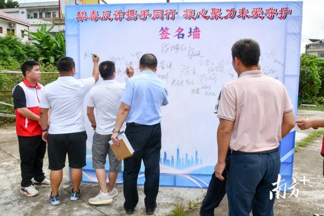 参会人员在禁毒反诈签名墙上签名,以己之名宣誓参与禁毒、反诈的决心。