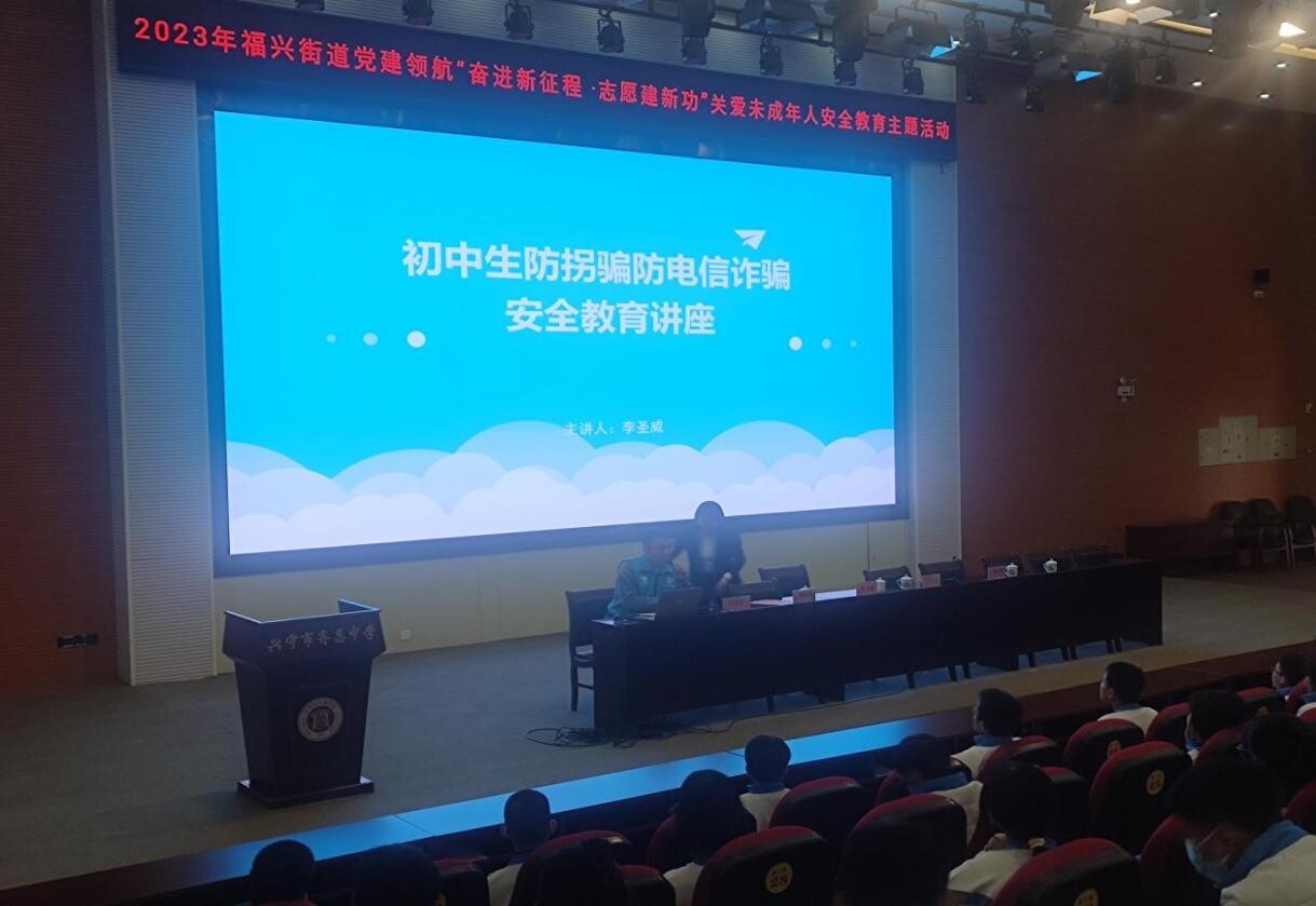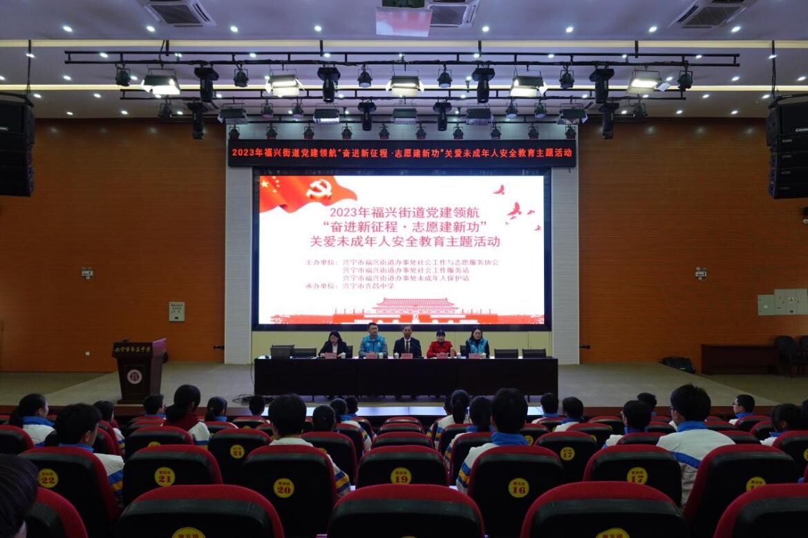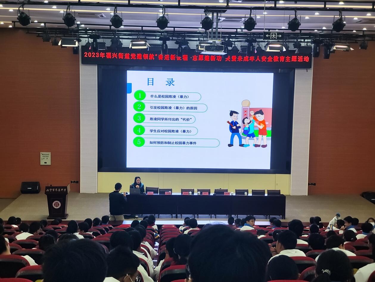 每个孩子平安健康成长是学校和家长的共同期盼。为进一步保障学生身心健康,建设平安和谐校园,2023年12月5日上午,福兴街道党工委、办事处组织社会工作和志愿服务协会、社工站、未成年人保护站联合时光直播 齐昌中学举办2023年福兴街道党建领航“奋进新征程·志愿建新功”关爱未成年人防校园欺凌、防拐骗安全教育主题活动,校方领导张英飞校长、福兴街道公用事业社会保障服务中心主任朱冬梅出席了活动,活动由妇委主任陈斯春主持,参加安全教育讲座约216名学生(其中45名留守儿童)。