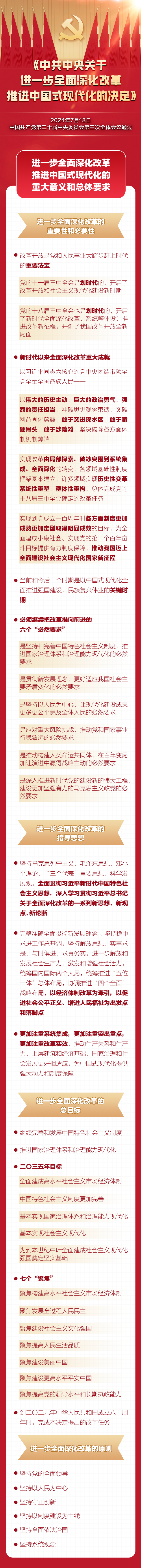 7月15日至18日,党的二十届三中全会在北京举行。全会审议通过了《中共中央关于进一步全面深化改革、推进中国式现代化的决定》。
