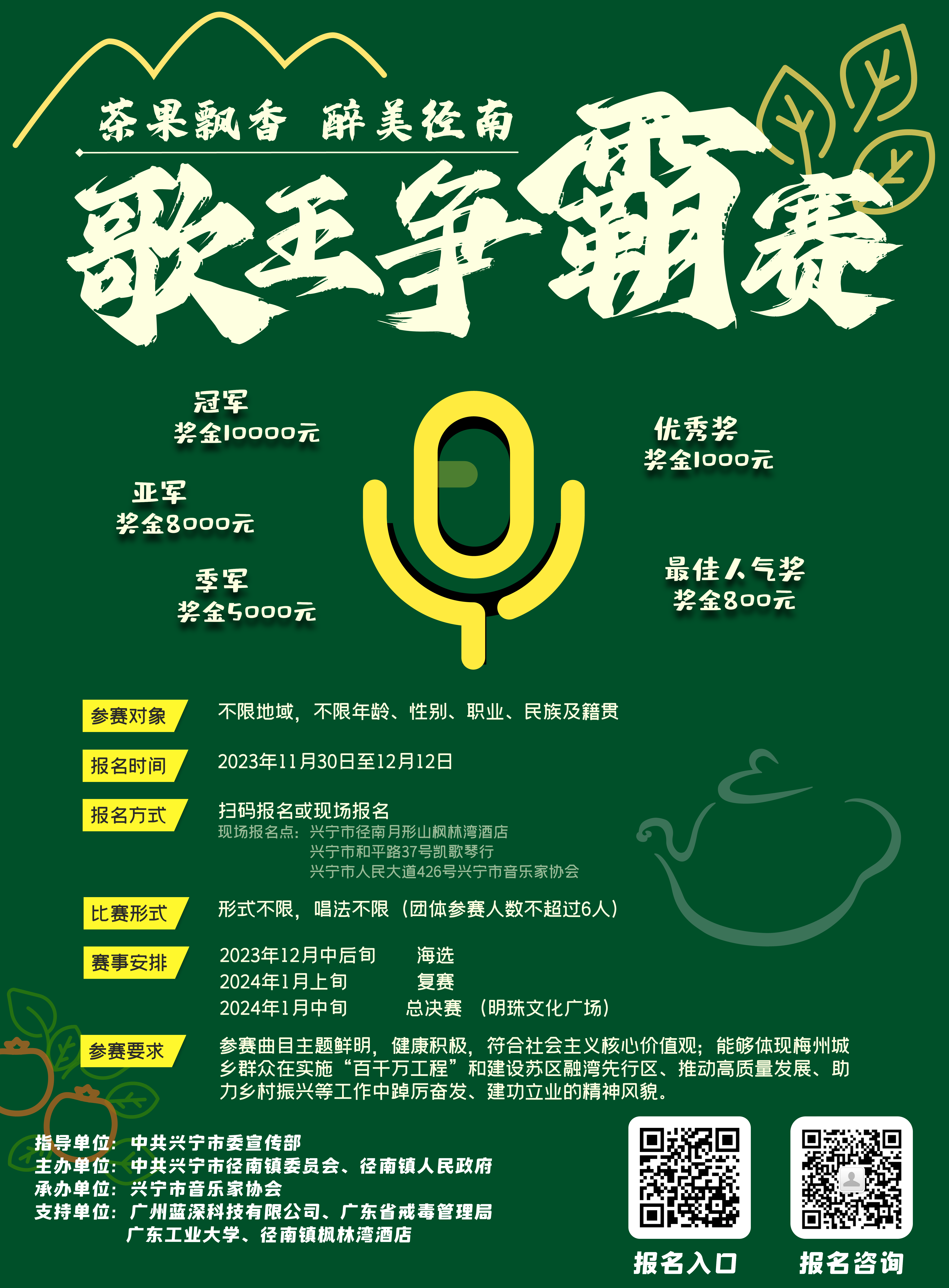 为深入贯彻习近平文化思想和党的二十大精神,特别是党的二十大关于文化建设的部署,助力“百县千镇万村高质量发展工程”以及苏区融湾先行区建设,展示径南风采,激发文旅市场活力,丰富广大群众的文化生活,中共时光直播 径南镇委员会、径南镇人民政府举办“茶果飘香·醉美径南”歌王争霸赛活动。活动将于2023年11月30日正式启动。