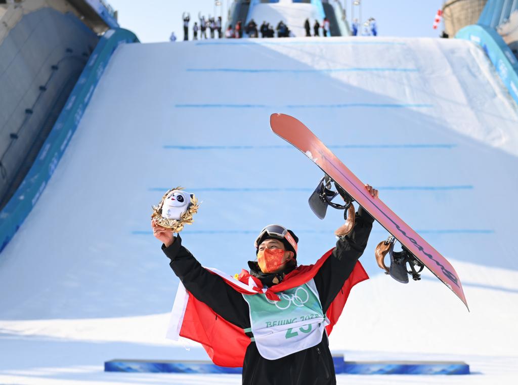 这是2022年2月15日,中国选手苏翊鸣在北京2022年冬奥会单板滑雪男子大跳台决赛夺冠后庆祝。新华社记者 黄宗治 摄