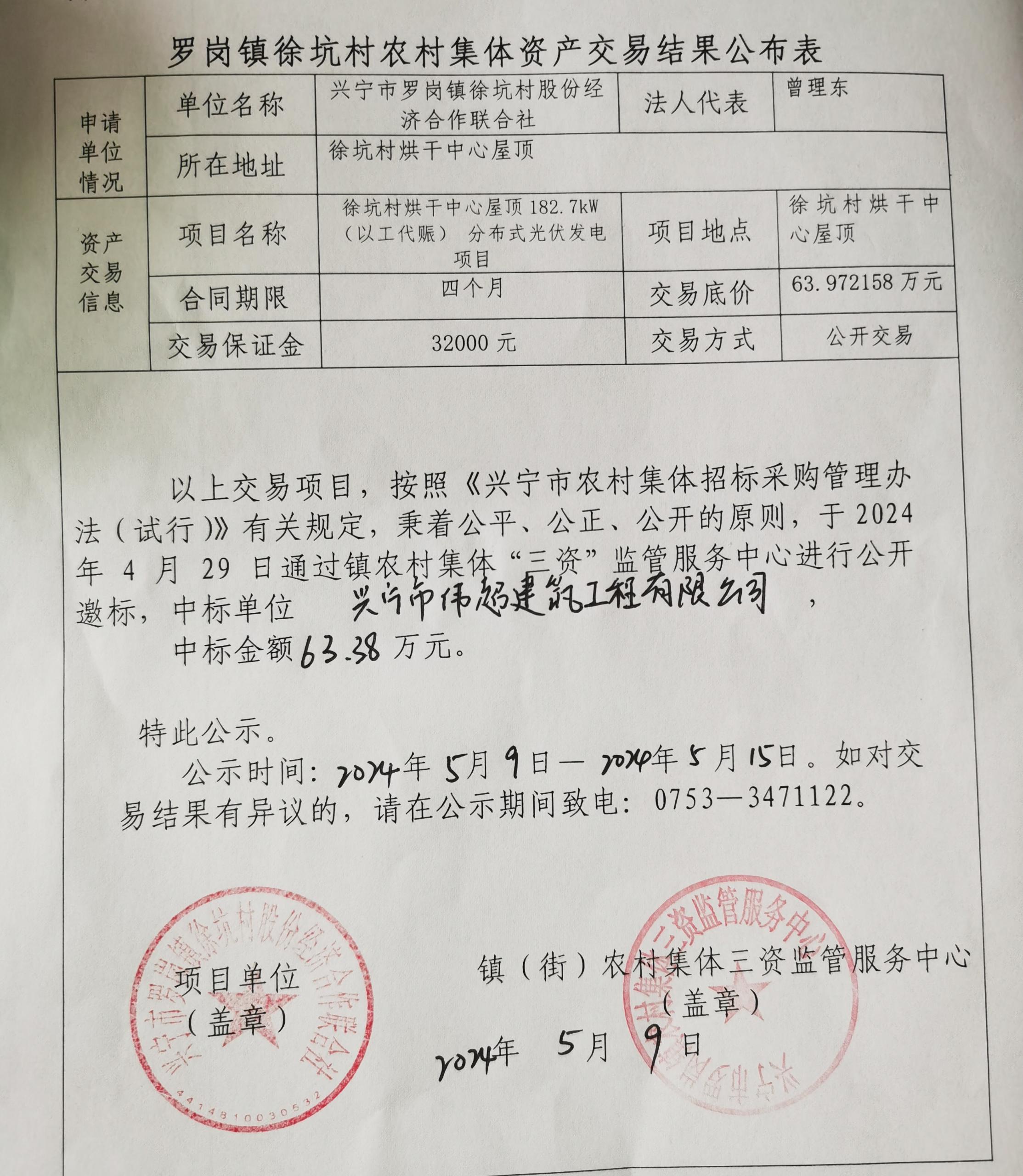 罗岗镇徐坑村农村集体资产交易结果公布表