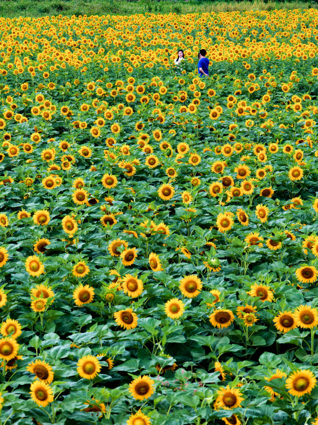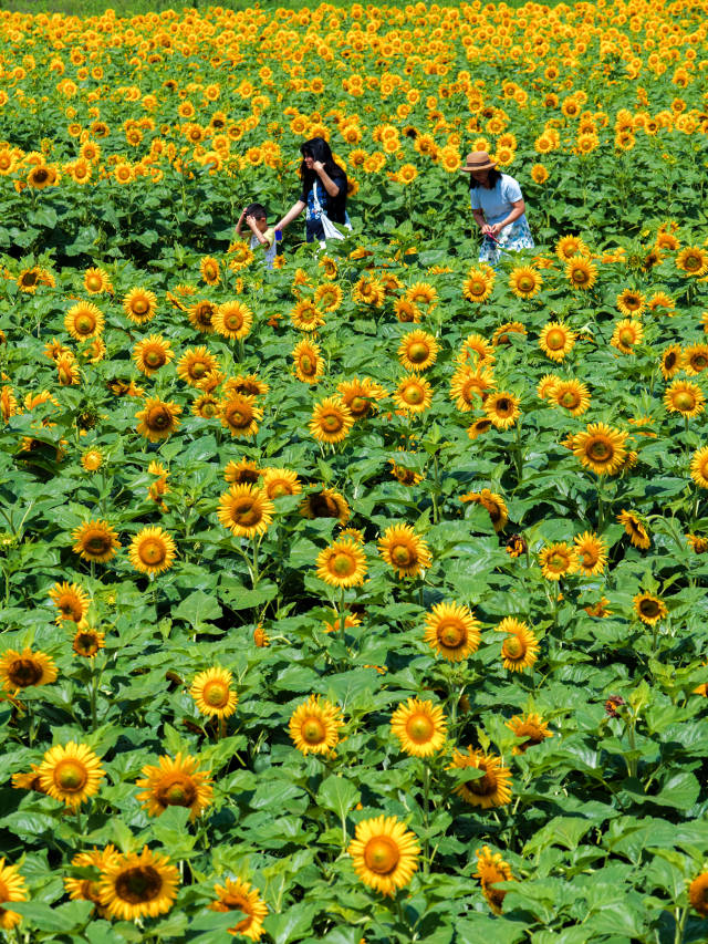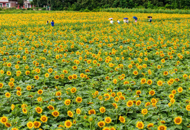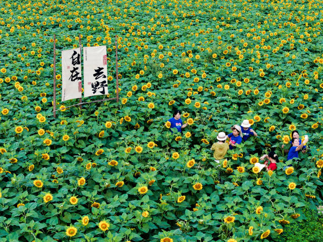 走进基地,连绵起伏的田野被明艳的向日葵铺满,花朵随风摇曳,与远处的村落相映成趣。