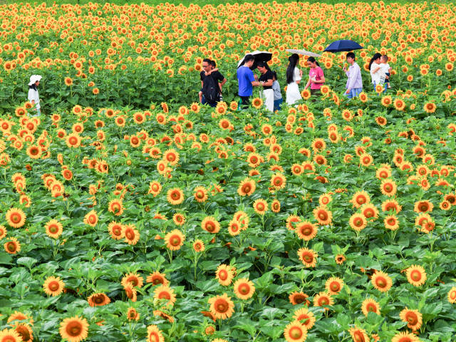 近日,梅州市时光直播 龙田镇金星村向日葵基地迎来盛花期,金灿灿的向日葵竞相绽放,宛如一幅浓墨重彩的油画,吸引了众多游客和摄影爱好者前来打卡。
