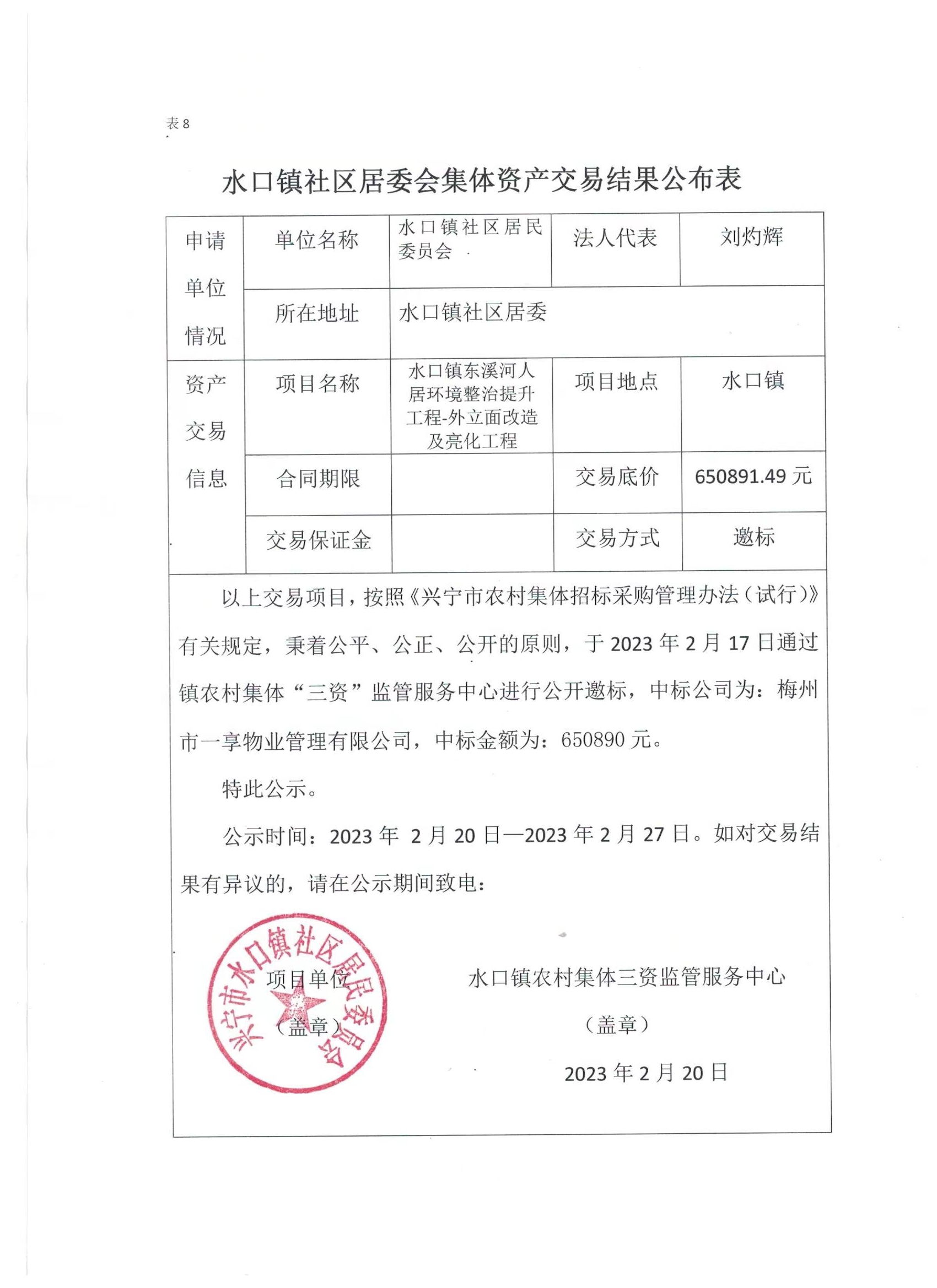 水口镇社区居委会集体资产交易结果公布表