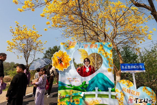 走在蓝布村党建公园,抬头看天,在清澈的蓝色“幕布”下,一片片黄花风铃开得烂漫,中间岔出三两枝丫,画面格外清新;远望,绿色的草地与粉的黄的花朵交相辉映,草坪上,还有扎好天幕露营的人们,间有小孩奔跑玩耍,分外热闹。走在花间小道上,三两步便能看到穿着马面裙拍照的游客,以及端着“长枪短炮”的摄影师。在主办方设置的以黄花风铃为造型“打卡点”前,还有不少游客们排队等待,留下美照。