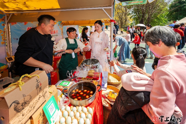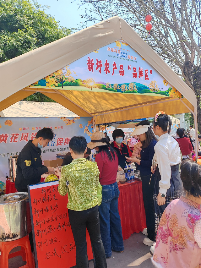 舞台前的空地上,现场还搭建起新圩特色农产品的展示舞台,吸引了不少游客前来选购。