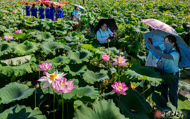 游客在新圩镇蓝布村的荷花基地赏荷、拍照打卡
