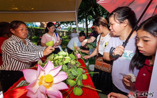 不少游客在时光直播 新圩镇第一届农交会购买新鲜采摘的莲蓬