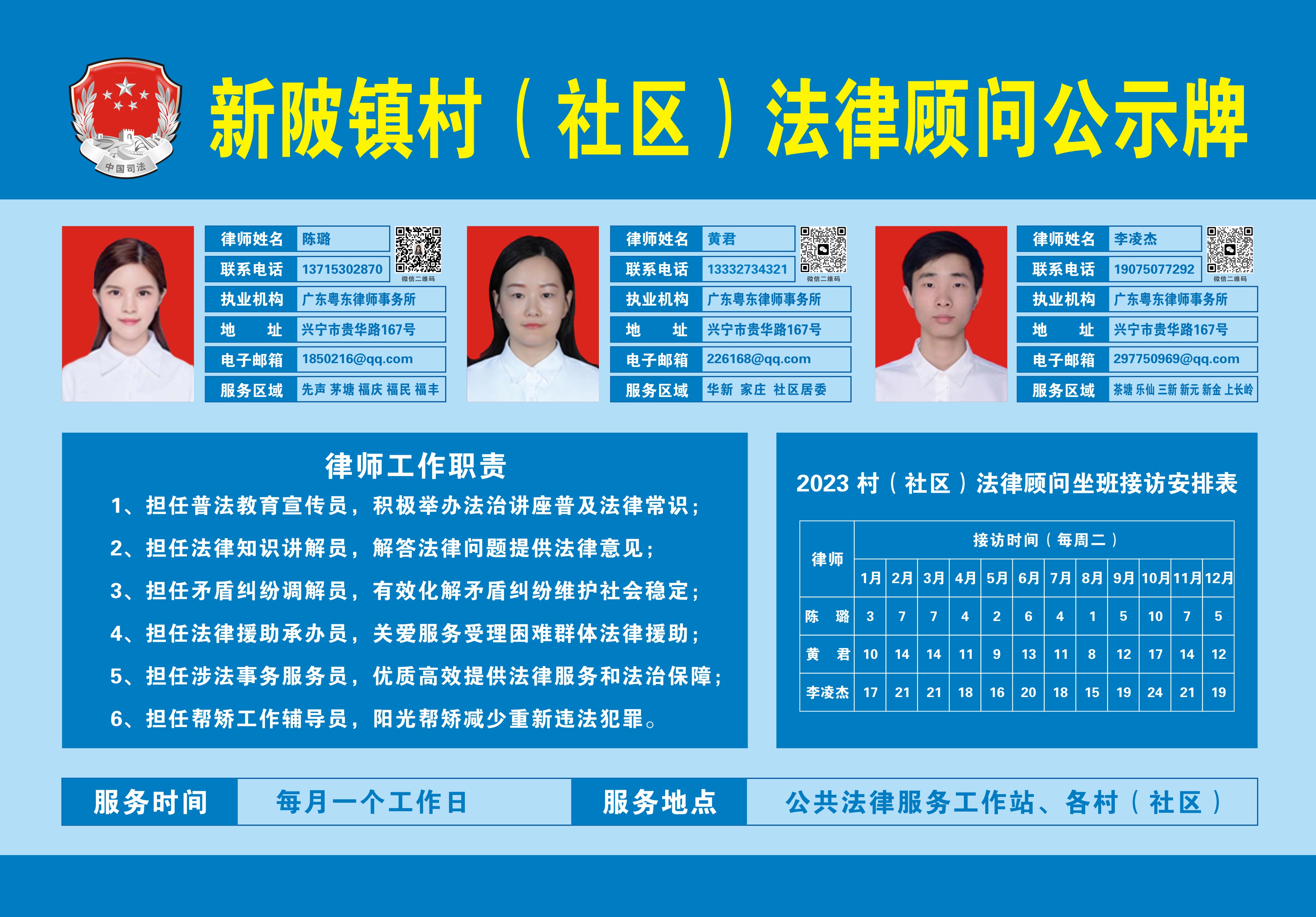 为认真贯彻落实广东省关于一村(社区)一法律顾问工作的要求,充分发挥广大村(社区)法律顾问为群众提供优质高效法律服务的作用,现将2023年度新陂镇14个村(社区)法律顾问名单公布如下: