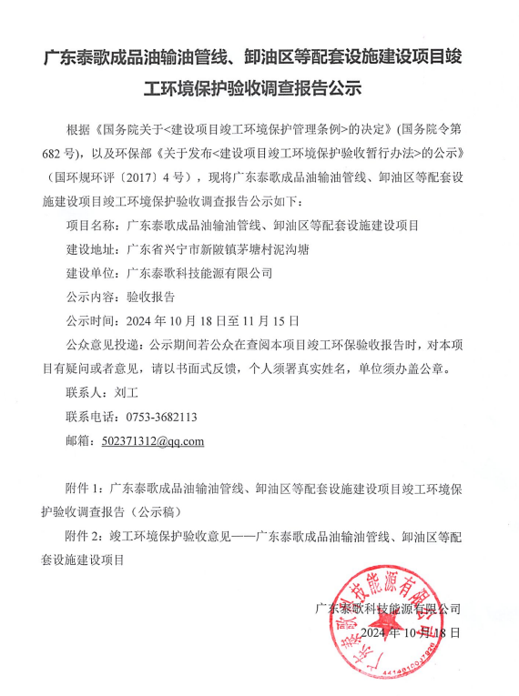 广东泰歌成品油输油管线、卸油区等配套设施建设项目竣工环境保护验收调查报告公示