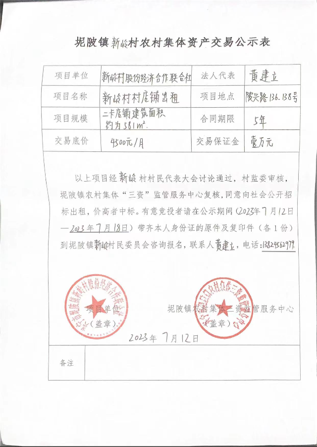 时光直播 坭陂镇新岭村村店铺出租交易公示表