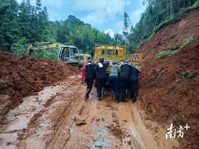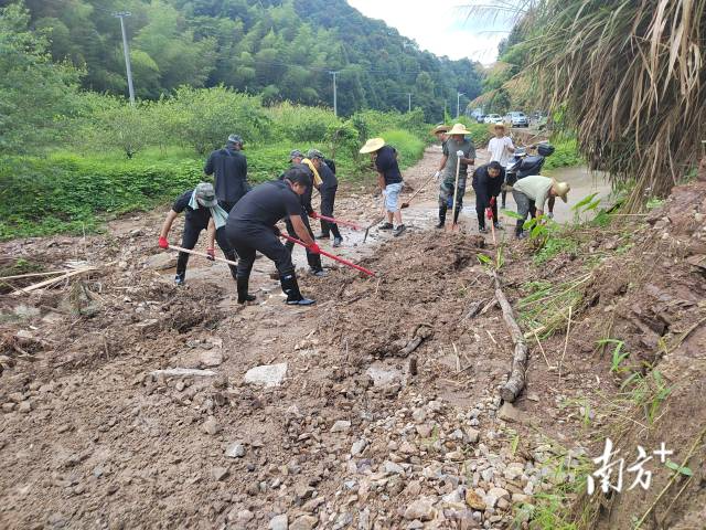 梅雨季节,天气晴雨不定,吸饱了雨水的黄泥混合着落石断竹,横亘在路边,挡住了村道。一把铁锹、一把锄头、一双手,队员们用汗水清扫出一堆堆碎石泥沙,不仅要克服恶劣的户外作业条件,还要时刻警惕次生灾害,“听到头顶山坡上的断枝松动,我马上喊大家撤离。”支援工作组组长刘金灵说。第一天,由坭陂、刁坊、大坪三镇组成的30人队伍,清淤清障5公里,清理水沟500米,疏通了到村委的主要道路。