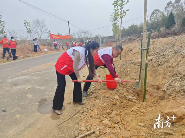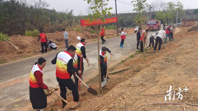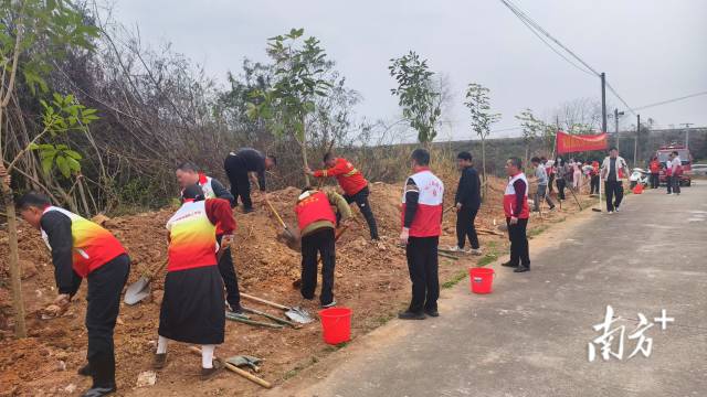 在活动现场,党员干部、志愿者三五成群,大家干劲十足,分组协作,挥锹铲土、植苗扶树、填土浇水……每个环节都认真细致,井然有序,一派热火朝天的忙碌景象。一番汗水挥洒过后,一棵棵树木昂首挺立,为坭陂大地新增一片盎然绿意。