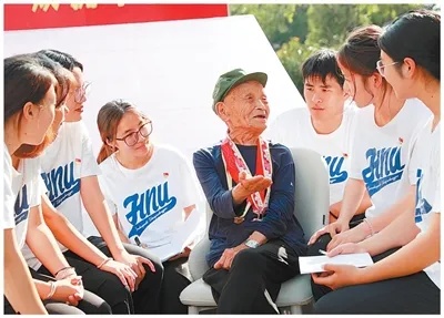 抗战老兵马凤俭向志愿者讲述革命故事。洪 星摄