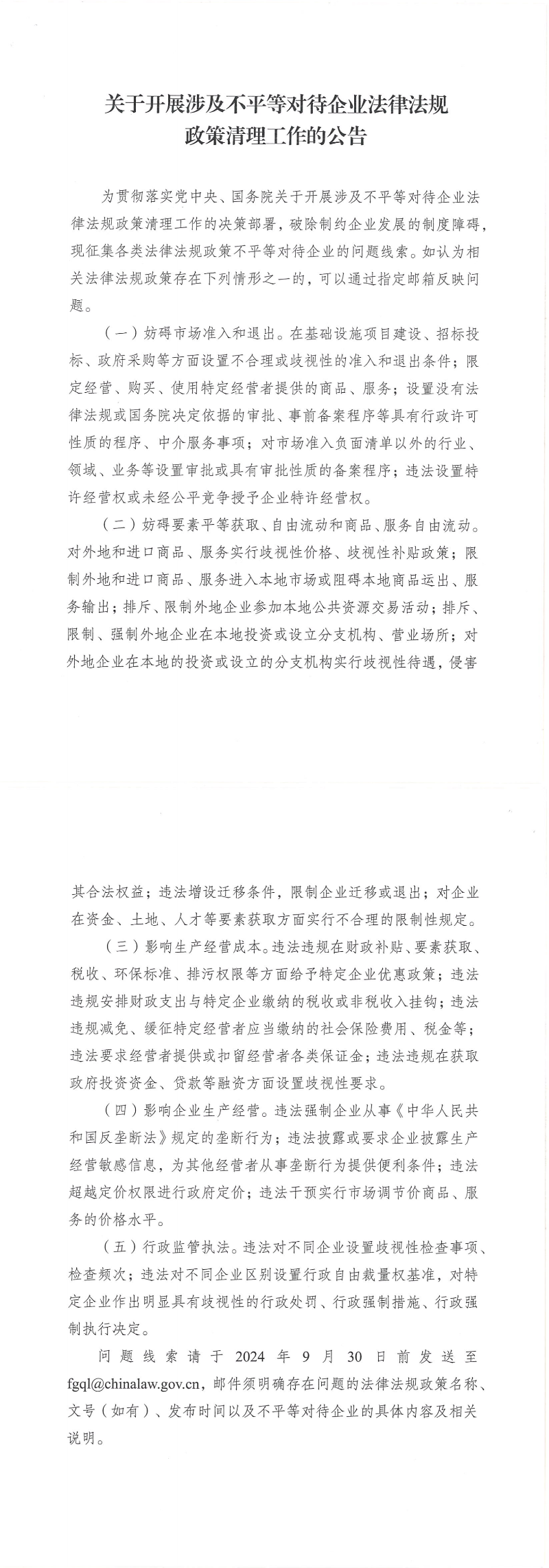 关于开展涉及不平等对待企业法律法规政策清理工作的公告