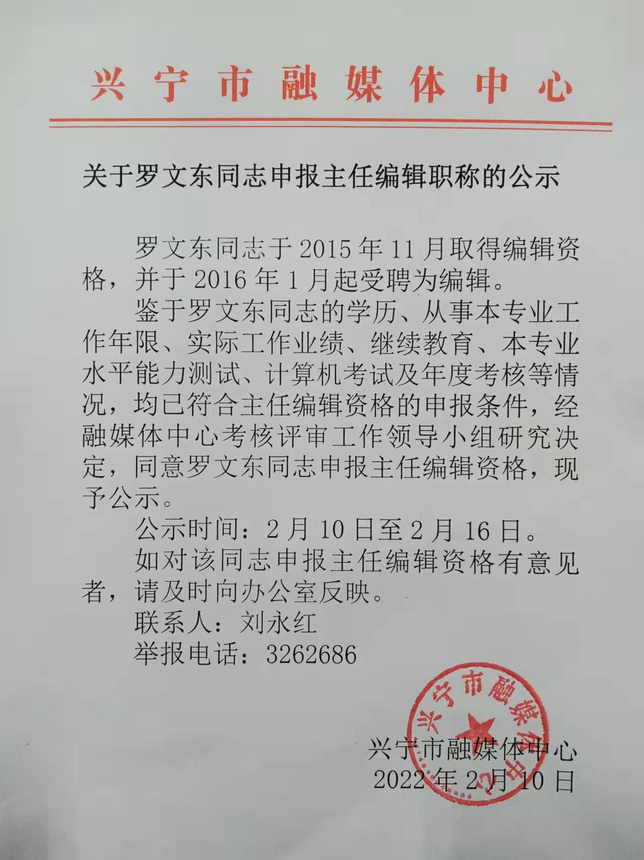 关于罗文东同志申报主任编辑职称的公示