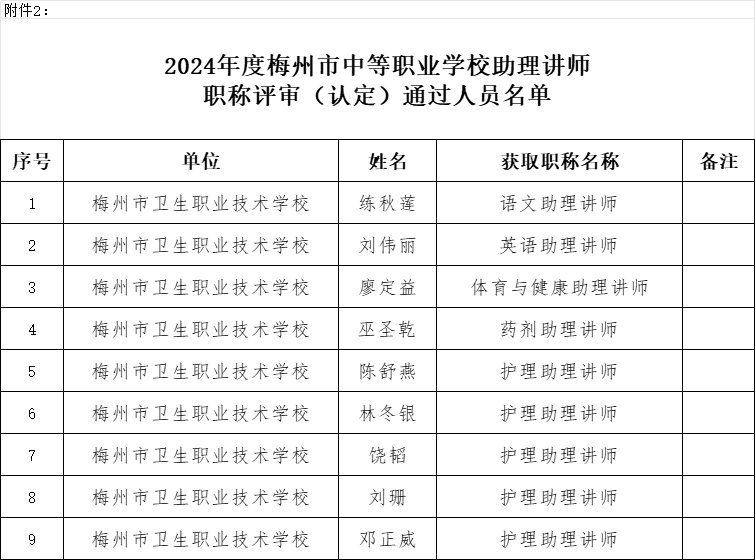 经梅州市职业技术学校教师职称评审委员会评审,下列同志获得讲师、助理讲师职称,现予公示。公示时间从2025年 4 月 30 日至 5 月 12 日止(不含公示当天,共5个工作日)。公示期间,任何单位和个人如对公示内容有异议,可在公示期内(以邮戳为准)以书面形式向所在单位纪检、监察部门反映。单位反映需加盖公章,个人反映需署真实姓名和联系电话,否则视为无效,一律不予受理。反映公示对象的情况和问题,应坚持实事求是的原则,不得借机诽谤和诬告。
