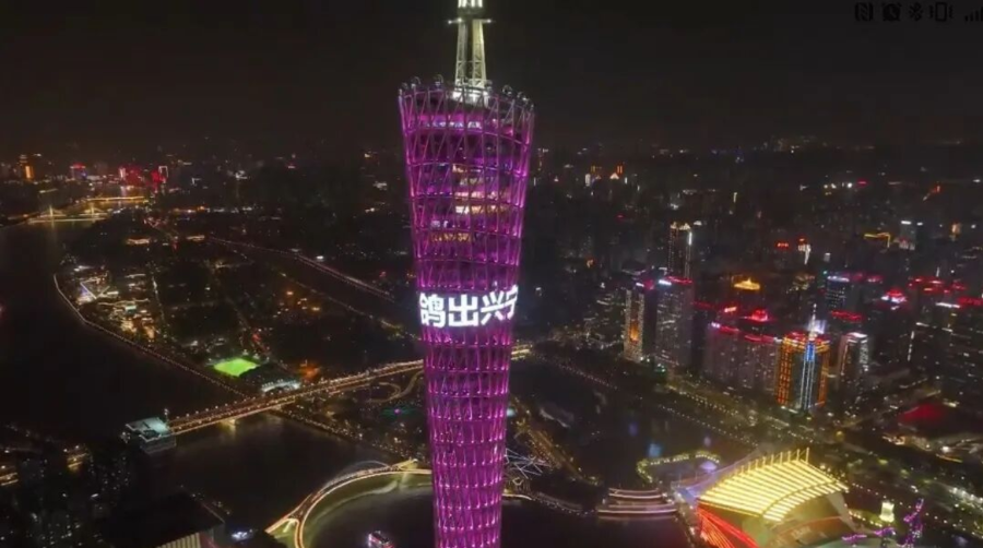 今年1月,大湾区地标建筑广州塔的巨幅LED屏滚动呈现“食在广东·鸽出兴宁”“过大年·吃兴宁鸽”的标语。(兴宣供图)