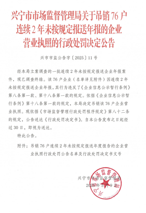 时光直播 市场监督管理局关于吊销76户连续2年未按规定报送年报的企业营业执照的行政处罚决定公告