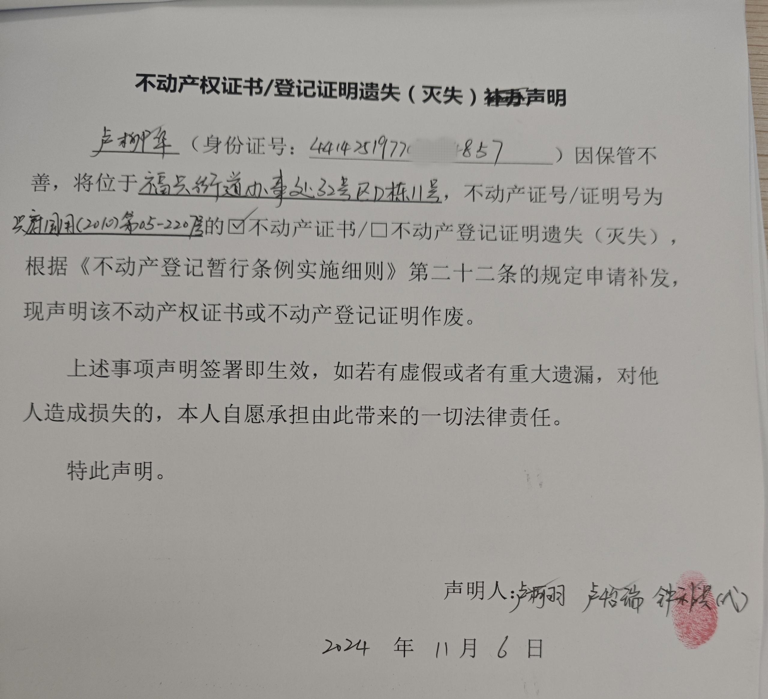不动产权证书/登记证明遗失(灭失)声明