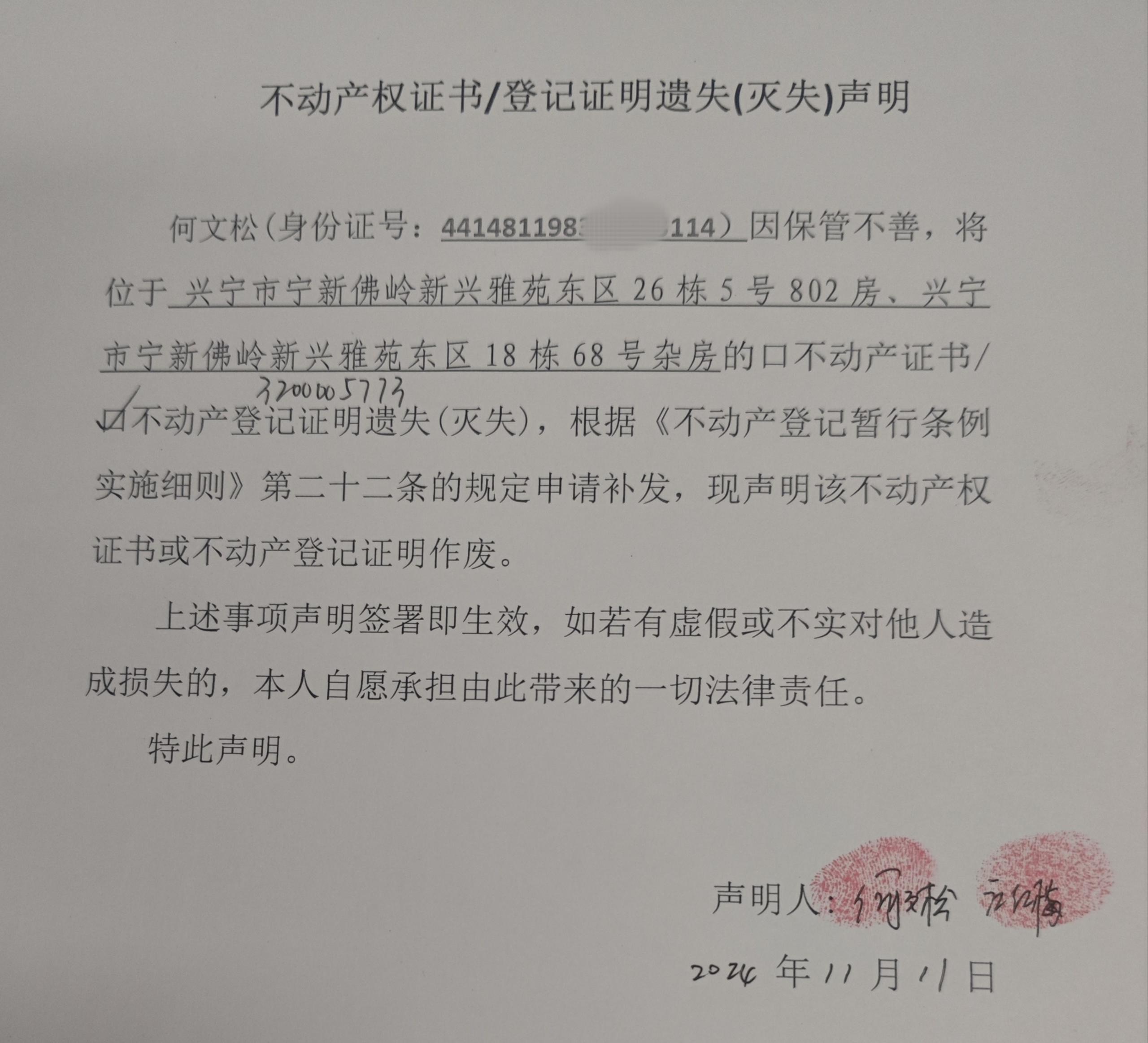 不动产权证书/登记证明遗失(灭失)声明