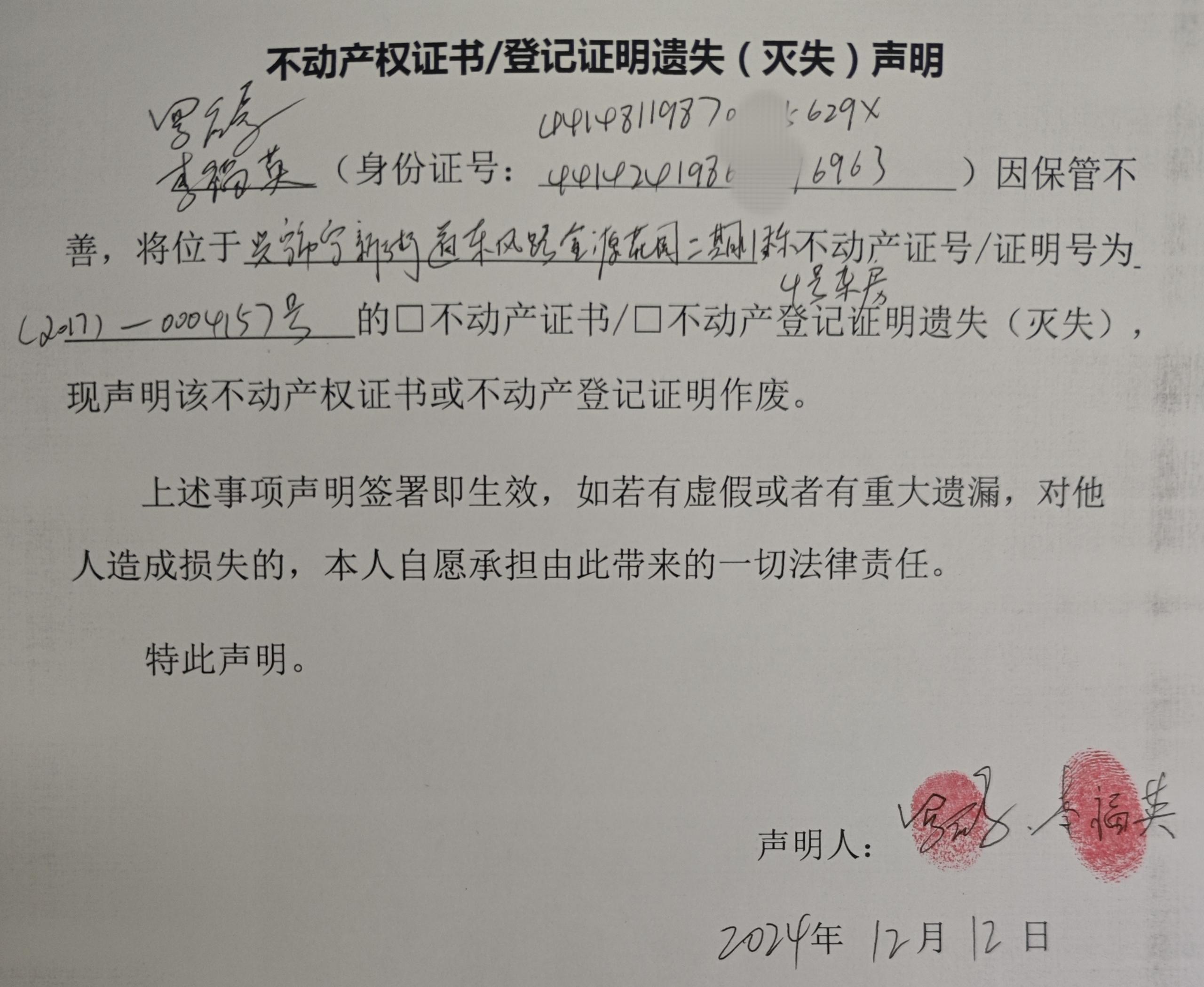 不动产权证书/登记证明遗失(灭失)补办声明