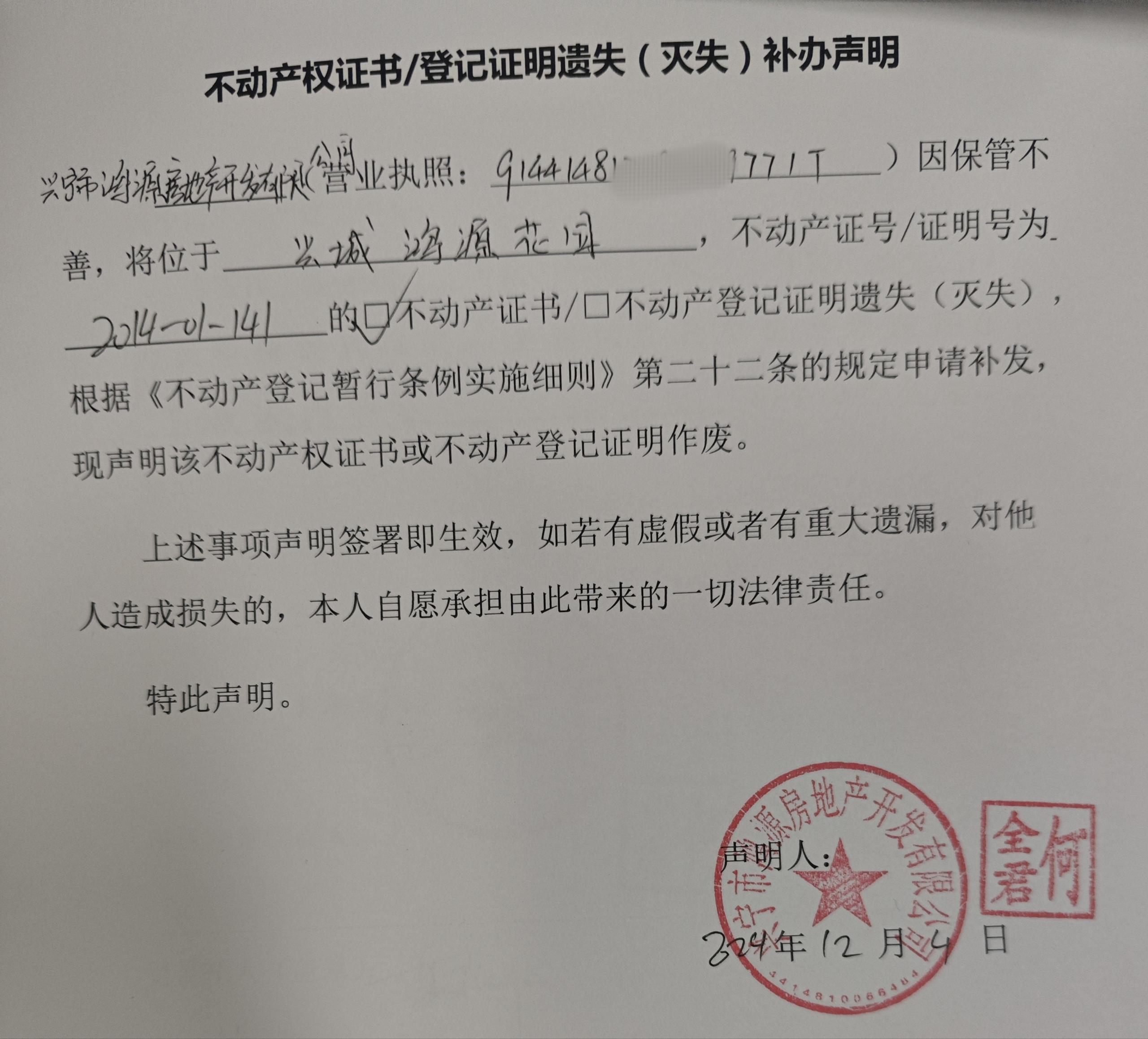 不动产权证书/登记证明遗失(灭失)补办声明
