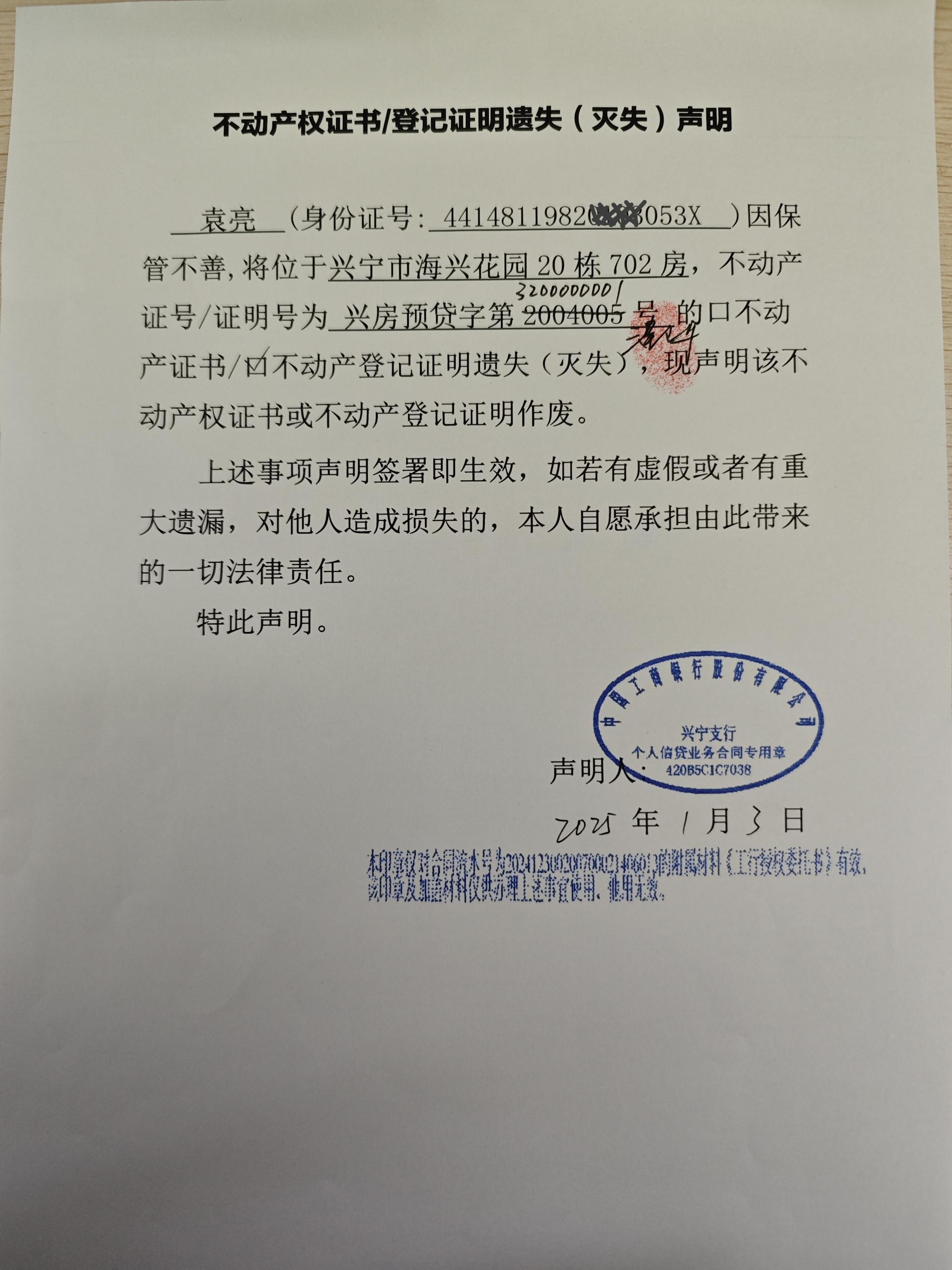 不动产权证书/登记证明遗失(灭失)声明