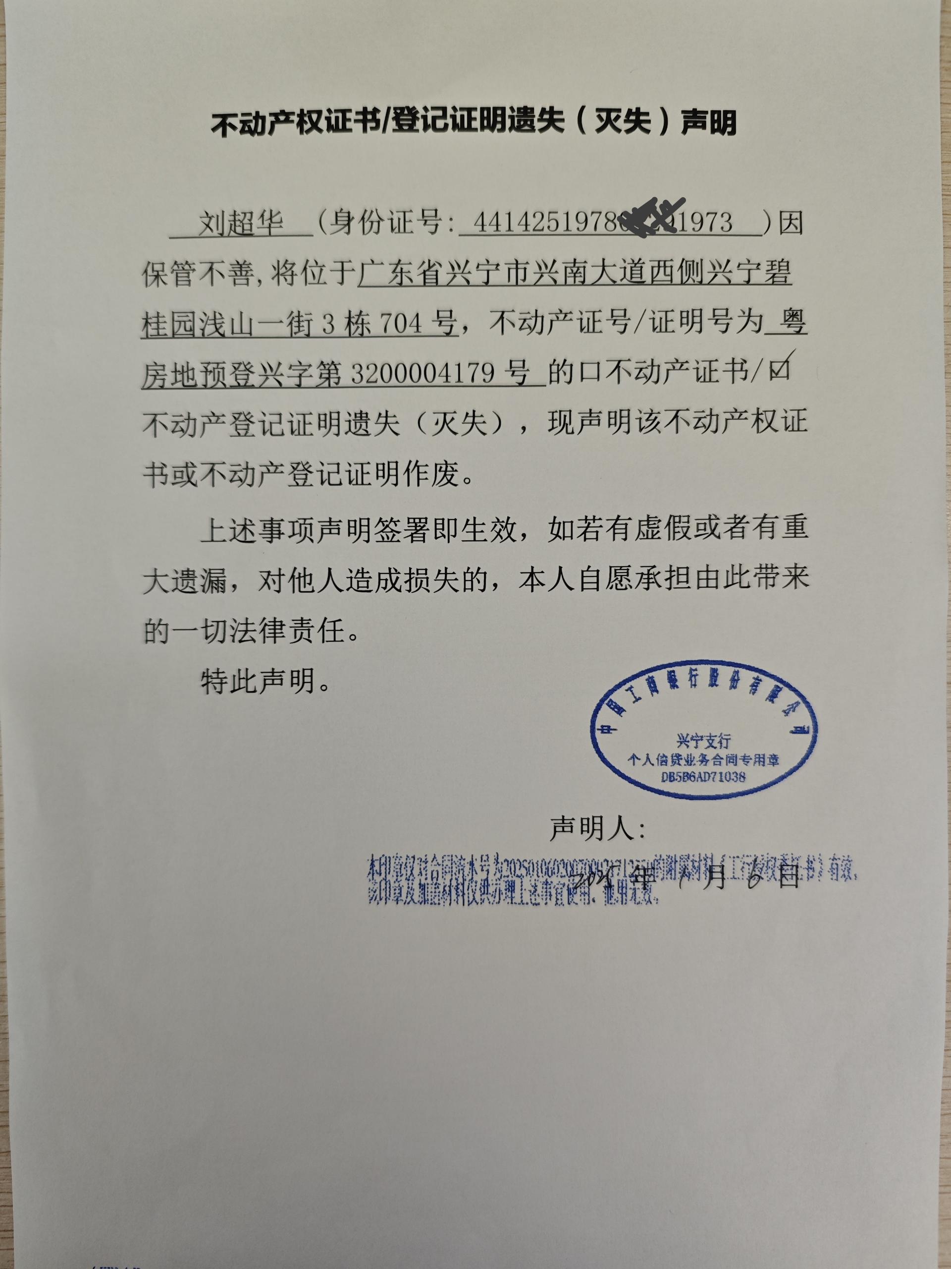 不动产权证书/登记证明遗失(灭失)声明
