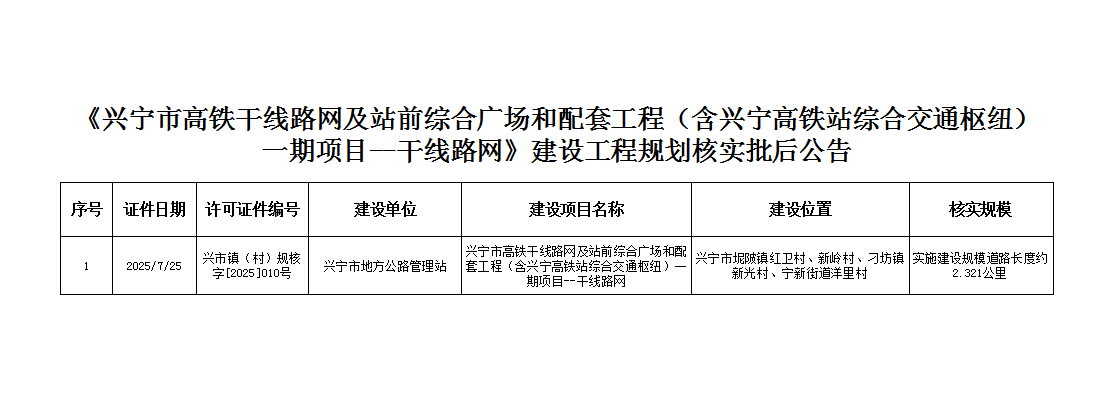 《时光直播 高铁干线路网及站前综合广场和配套工程(含兴宁高铁站综合交通枢纽)一期项目--干线路网》建设工程规划核实批后公告