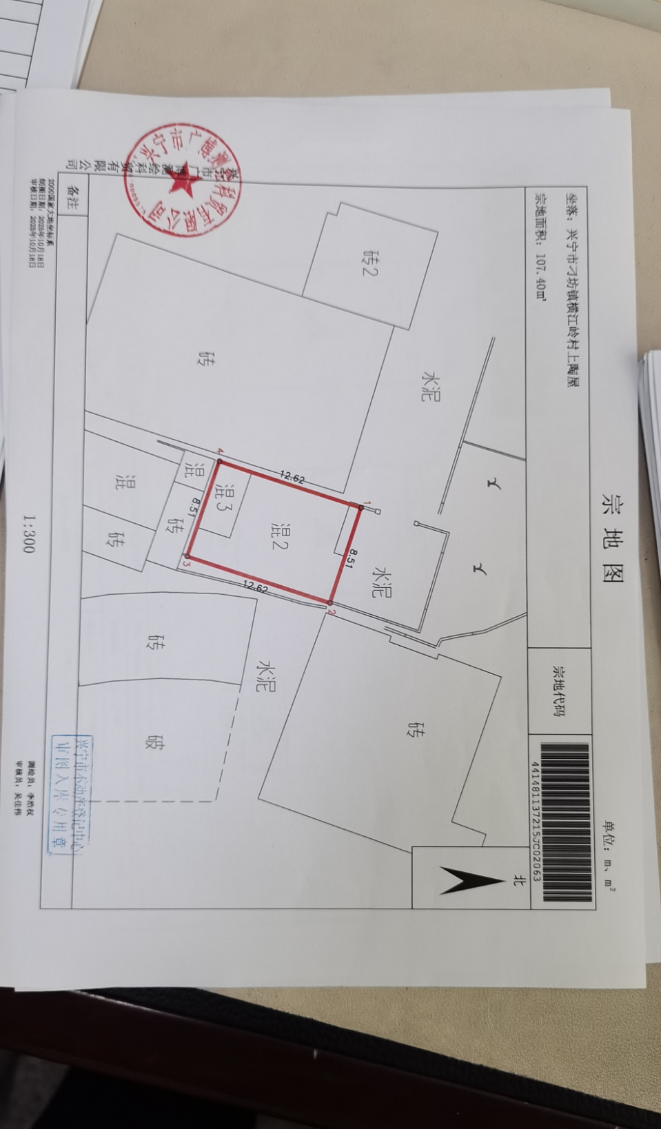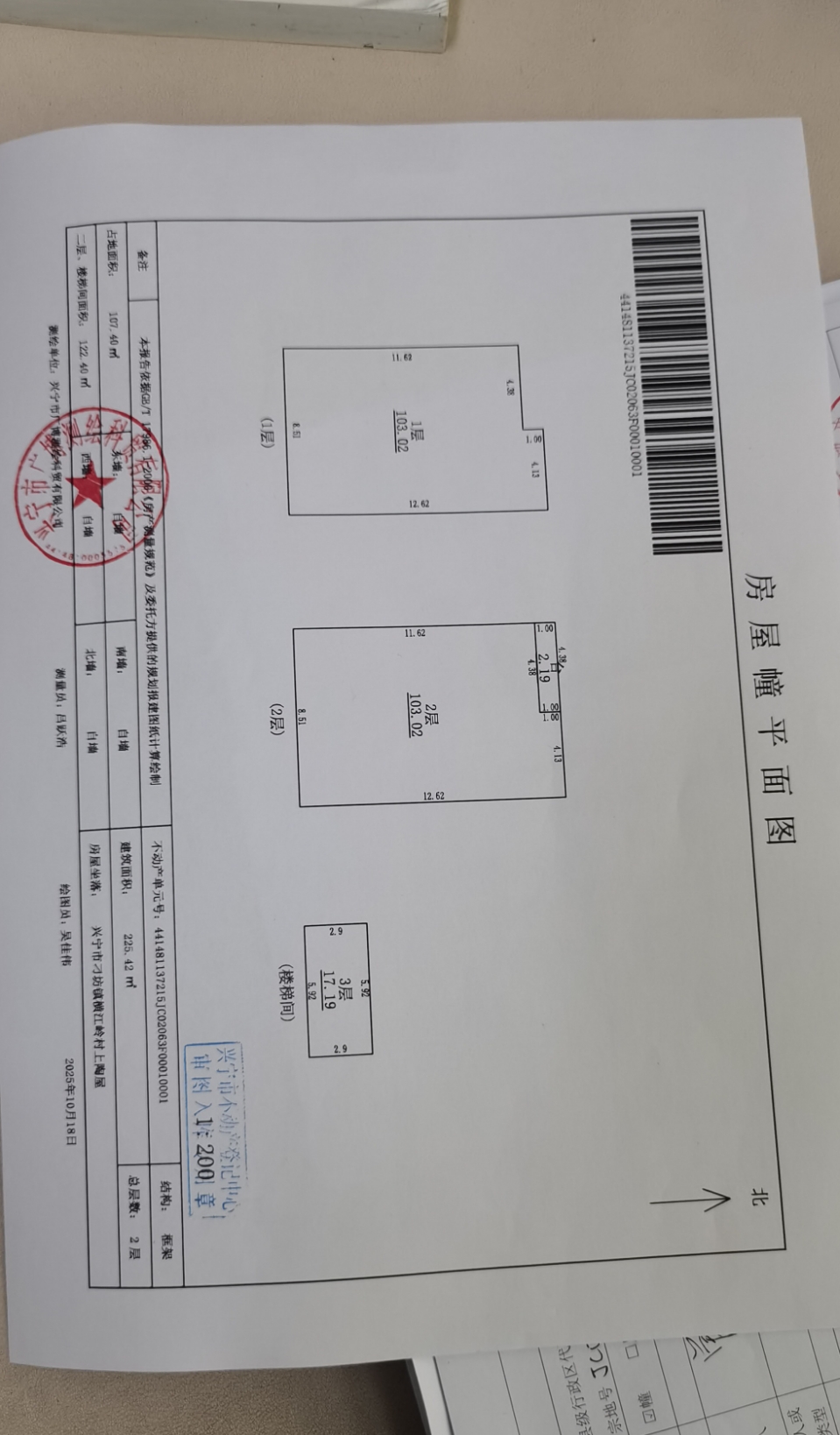二、土地权属性质:集体所有;土地使用权面积:107.40㎡;房屋建筑面积:225.42㎡;四至:如图所示。