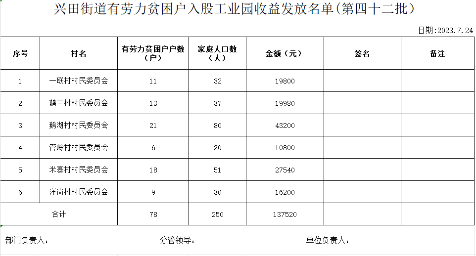(第四十二)兴田街道入股工业园有劳力户就业以奖代补发放名单