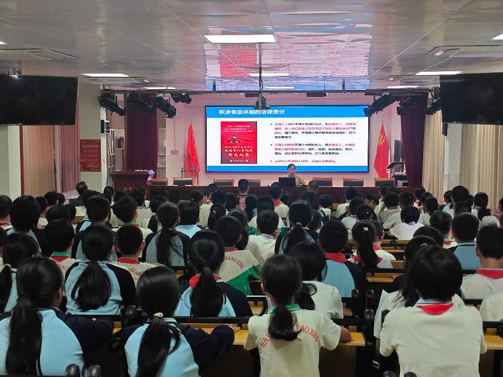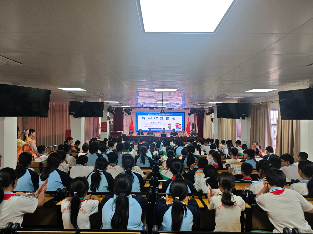 活动现场共200多名师生参加了讲座,其他班级则通过实时直播进行观看。宣讲老师借助生动的案例、形象的图片以及深入浅出的讲解,向学生们详细阐述了校园霸凌的定义、类型、原因、危害以及应对方式等多方面内容。结合前期发生的校园霸凌事件实例,让孩子们更为直观地认识到校园霸凌的严重危害,深刻明白校园霸凌绝不是小打小闹,而是可能触犯法律、影响一生的严重行为。在讲解过程中,孩子们全神贯注地聆听,时而露出震惊的表情,时而陷入沉思。他们真切地认识到,校园霸凌不仅仅是身体上的伤害,还包括言语上的攻击、社交上的孤立等多种形式,这些都会给受害者带来巨大的痛苦。