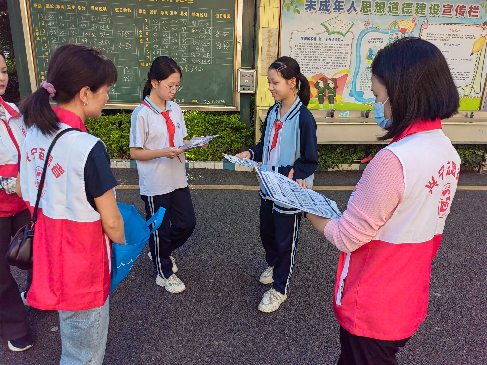 户外宣传同样毫不松懈。志愿者与社工在校园内向学生们发放精心制作的“五防”安全知识小册子,积极鼓励学生将所学知识带回家,与家长一同学习反对校园霸凌的安全知识、法律常识以及应对方法,切实提升孩子与家长的防范意识。一位学生拿着小册子,眼神中充满坚定地说:“我要把这个带回家给爸爸妈妈看,让他们也知道怎么保护我。”