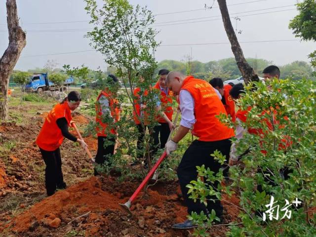 在现场,党员干部们干劲十足,挥锹挖坑,扶苗培土,引水浇灌,配合默契,精心栽种每一棵树。一抹抹靓丽的“志愿红”和绿植相互映衬,呈现出一派热火朝天的景象。