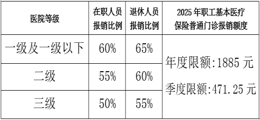 普通门诊待遇不设起付标准,报销比例和封顶线如下: