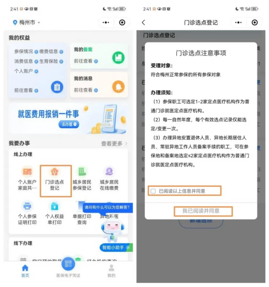 进入“粤医保”主界面的“我要办事”,进入“门诊选点登记”,勾选“已阅读以上信息并同意”,点击“我已阅读并同意”,进入“门诊选点登记”。