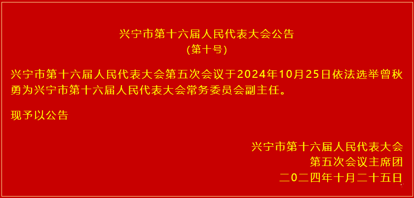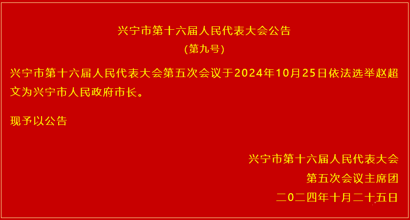 人大常委会副主任。随后,市人大常委会主任、大会主席团常务主席邓强为新当选的市人民政府市长赵超文、市人大常委会副主任曾秋勇颁发了当选证书。在与会全体代表的共同见证下,赵超文、曾秋勇进行了庄严的宪法宣誓。 新当选的市人民政府市长赵超文在会上作了发言。赵超文表示,来兴宁工作的这段时间里,深切感受到了兴宁苏区的文化底蕴和无限魅力,深切感受到了兴宁人民的勤劳坚韧和善良包容,深切感受到了兴宁干部的务实担当和拼搏劲头,深切感受到了兴宁发展的无限空间和巨大潜力,备受鼓舞、倍感振奋、倍增干劲。 赵超文表示,今后在市委的坚强领导下,在市人大、市政协和社会各界的监督支持下,在历届市政府班子打下的良好基础上,团结带领市政府班子,满怀激情争朝夕、干事业、促发展,奋力谱写中国式现代化兴宁实践新篇章。一是“一腔忠诚”讲政治,坚决把对党忠诚作为立身之本,坚定不移把政治建设放在首位,切实把思想和行动统一到以习近平同志为核心的党中央决策部署上来,不折不扣落实上级和市委工作要求,以实际行动忠诚拥护“两个确立”,坚决做到“两个维护”。二是“一门心思”抓发展,狠抓发展第一要务,以头号力度推动“百千万工程”提档进位,坚持实体经济为本、制造业当家,扎实推进苏区融湾先行区建设,加力推进广东省全民国防教育基地建设,全力促进工业园区发展、全域土地综合整治、重点项目建设等中心工作提质增效。三是“一心为民”办实事,始终心系百姓、秉公办事,把人民群众放在心中最高位置,把为民造福作为最大政绩,坚决把更多资源投向教育、就业、医疗、养老等民生领域,全力让兴宁人民的获得感、幸福感、安全感更加充实、更有保障、更可持续。四是“一丝不苟”慎用权,深入贯彻习近平法治思想,带头尊法、守法、学法、用法,不断提高政府工作的科学化、民主化、法治化水平,努力建设人民满意的法治政府、阳光政府、高效政府。五是“一身正气”作表率,把廉洁从政作为第一信条,坚定不移贯彻全面从严治党各项部署要求,扛牢政府系统党风廉政建设责任,坚持抓好班子、带好队伍,以清风正气护航高质量发展。 会议号召,全市人民要高举习近平新时代中国特色社会主义思想伟大旗帜,深入贯彻落实党的二十大和二十届二中、三中全会精神,全面落实上级和市委决策部署,扎实推进我市“百千万工程”提质增效,全力推动兴宁经济社会高质量发展。 大会在雄壮的国歌声中胜利闭幕。